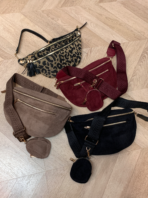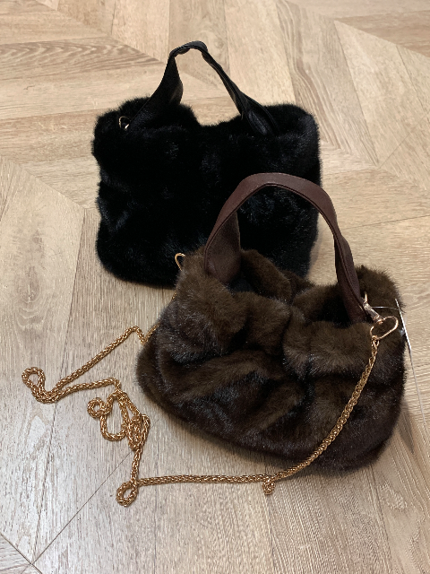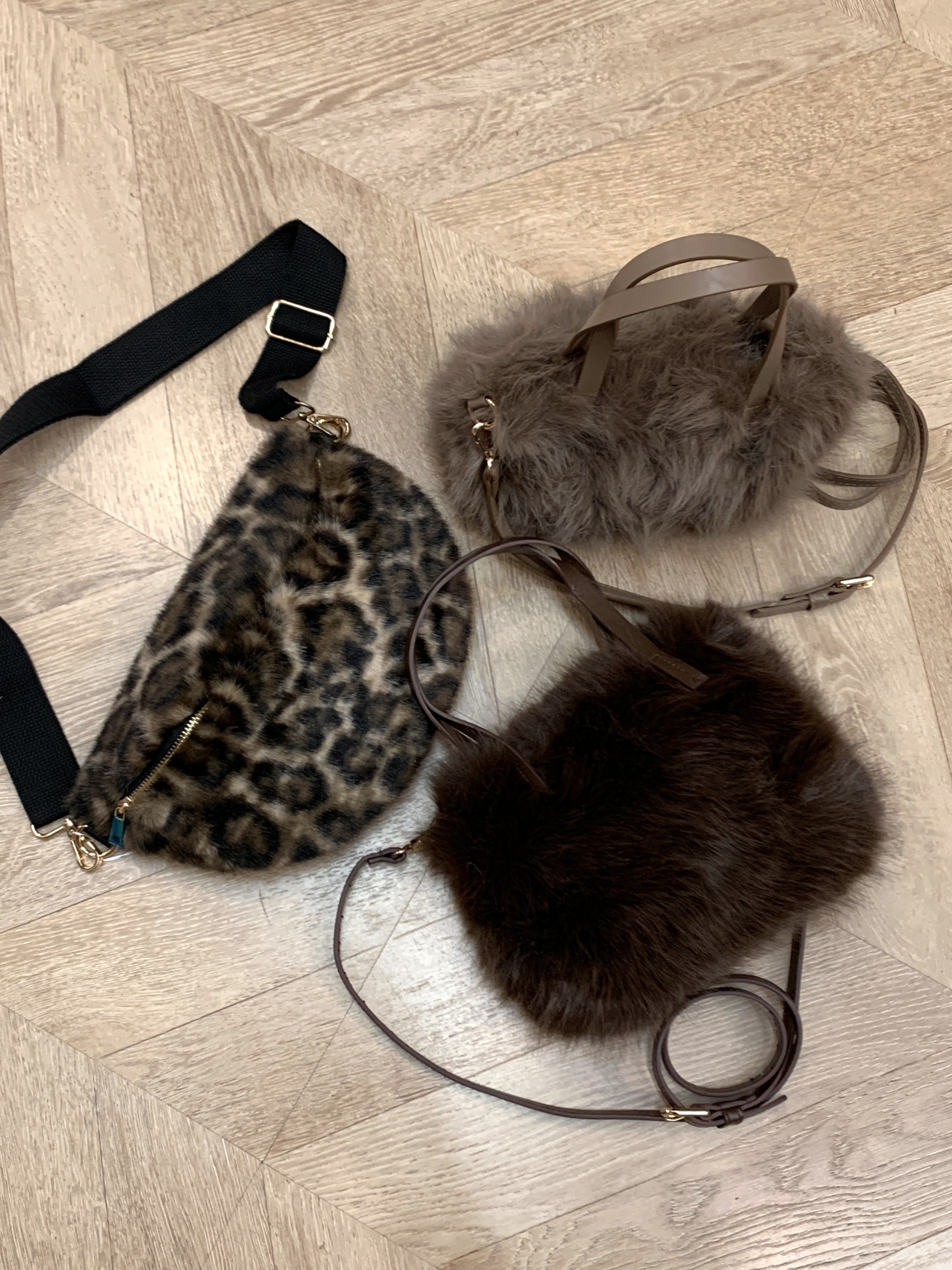 Banane en fausse fourrure léopard à 29€. Petits sacs en fausse fourrure à 35€.