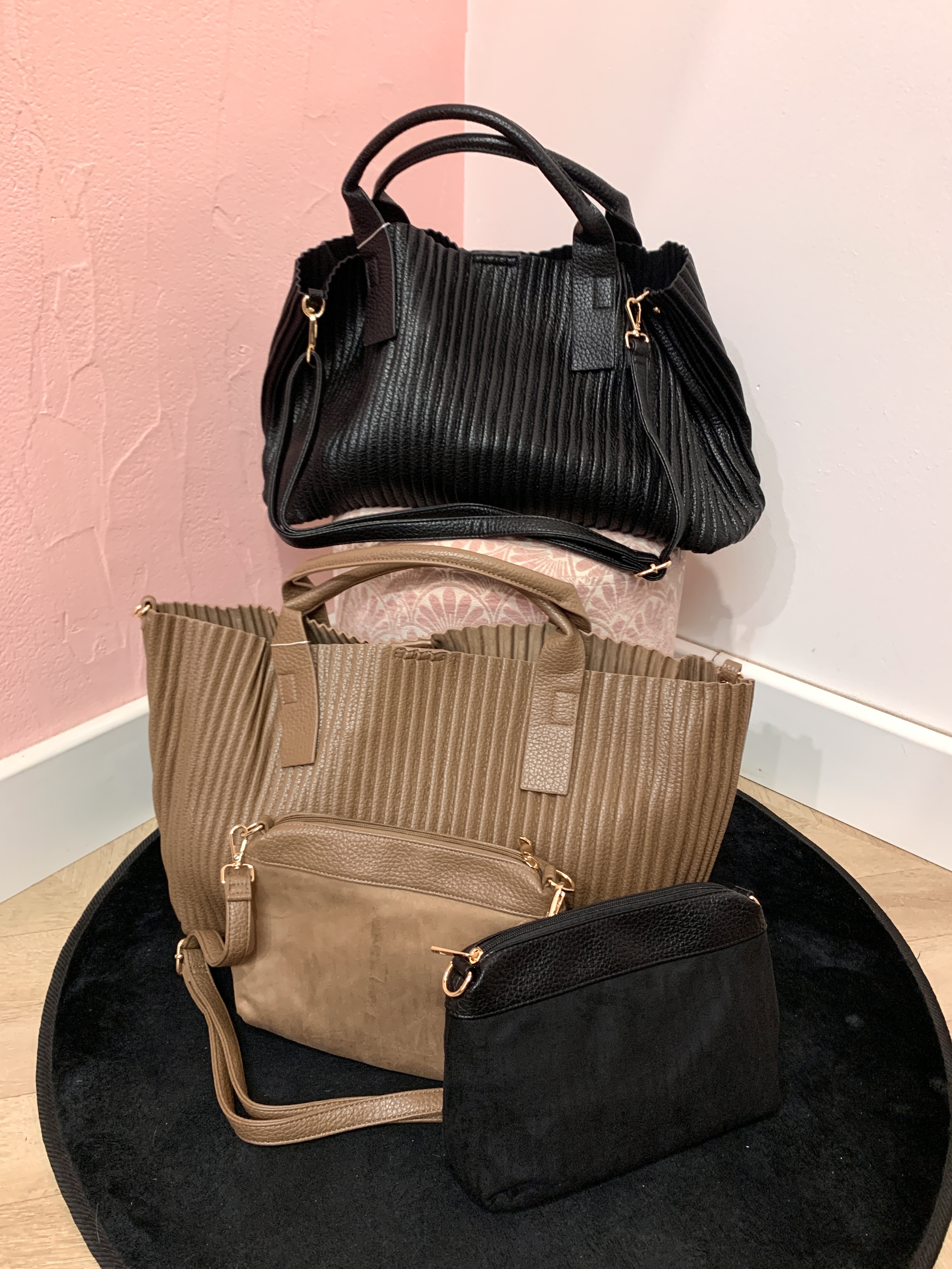 Grand cabas avec petite pochette que l’on peut aussi utiliser en sac si on met la bandoulière. Synthétique. 69€